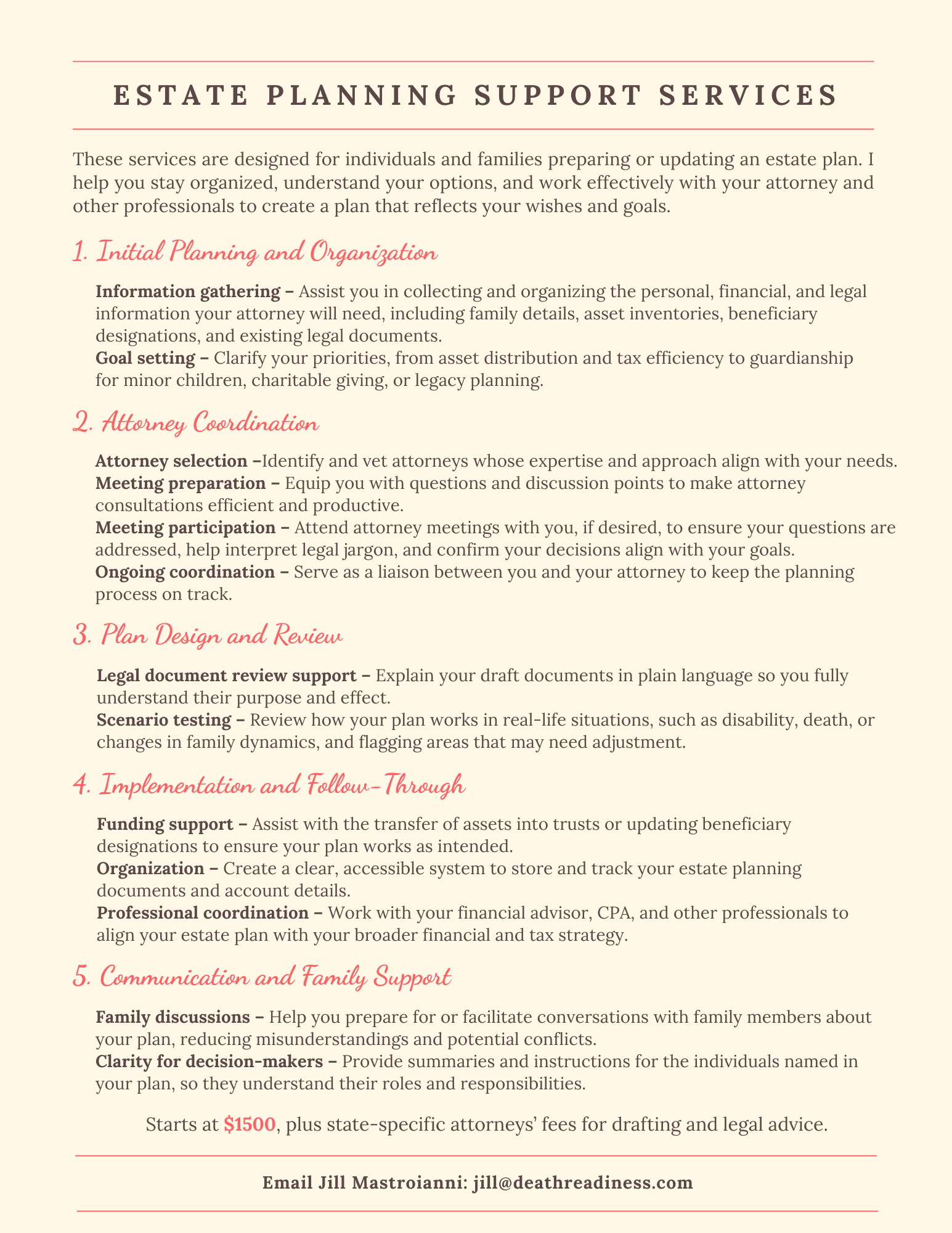 Estate planning help for families and caregivers. Jill Mastroianni provides support with attorney selection, plan review, funding, and family communication to reduce stress.